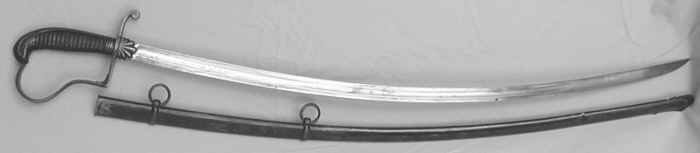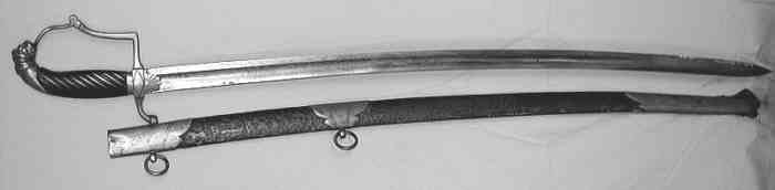 Auch als Infanterie-Offizier-Säbel M/1836 bezeichnet. Eckiges Tombak-Bügelgefäß mit Löwenkopf, schwarzer Holzgriff, Emblem "M" oder auch "L" unter Krone, Steckrückenklinge mit "L", Länge ohne Scheide 99 cm.